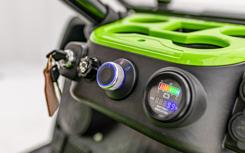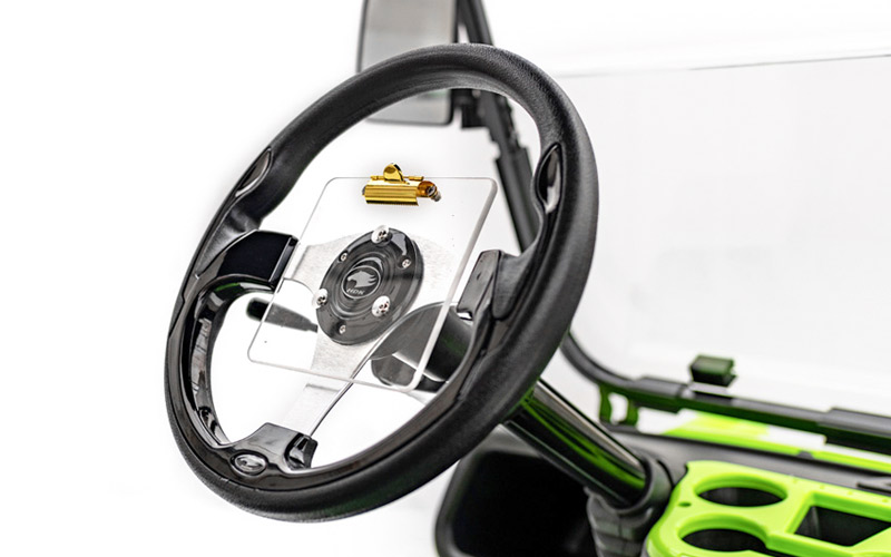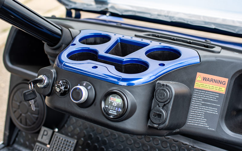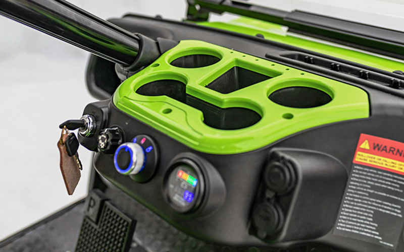 Modern details like a built-in cupholder designed to fit various cup sizes and minimize spills, and a 12V power outlet and a USB charger – all add extra practicality. It also includes a handy compartment for small accessories, such as a USB cable for charging devices on the go, ensuring a convenient, and organized ride every time you hit the course.